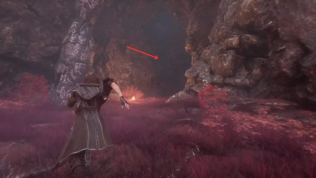 Take the left path first. Look carefully along the right wall as you go — there are handholds going down. Climb down, and you will find a Pictos called Burning Mark at the bottom.
