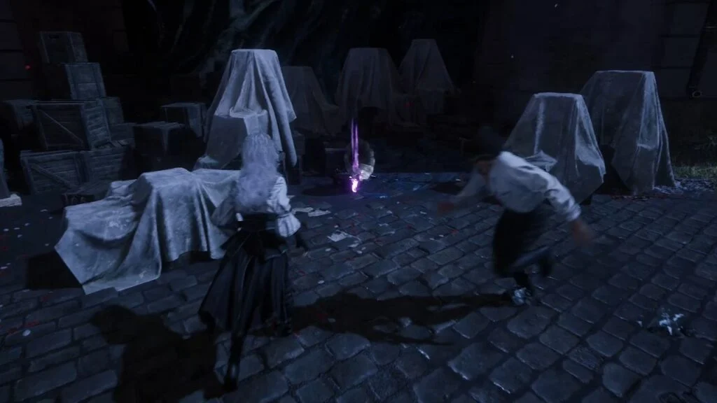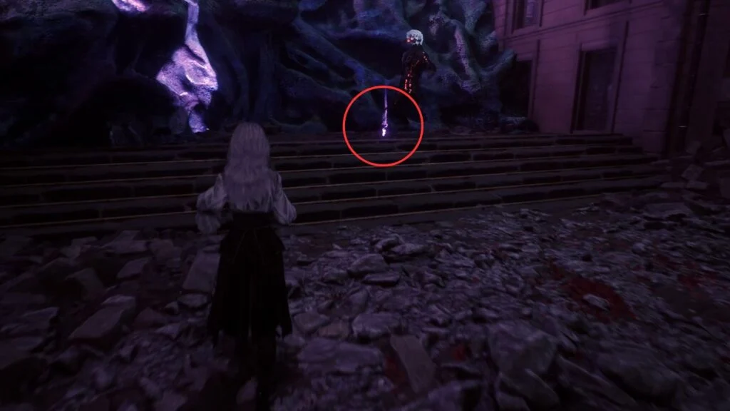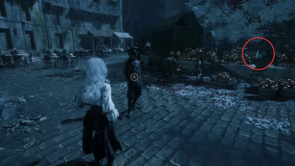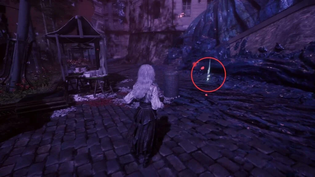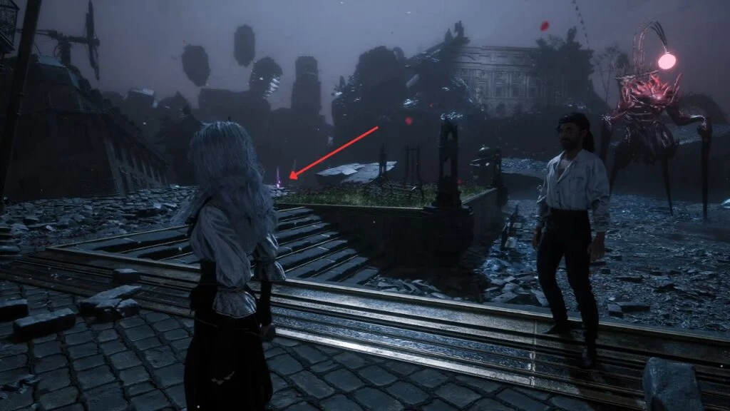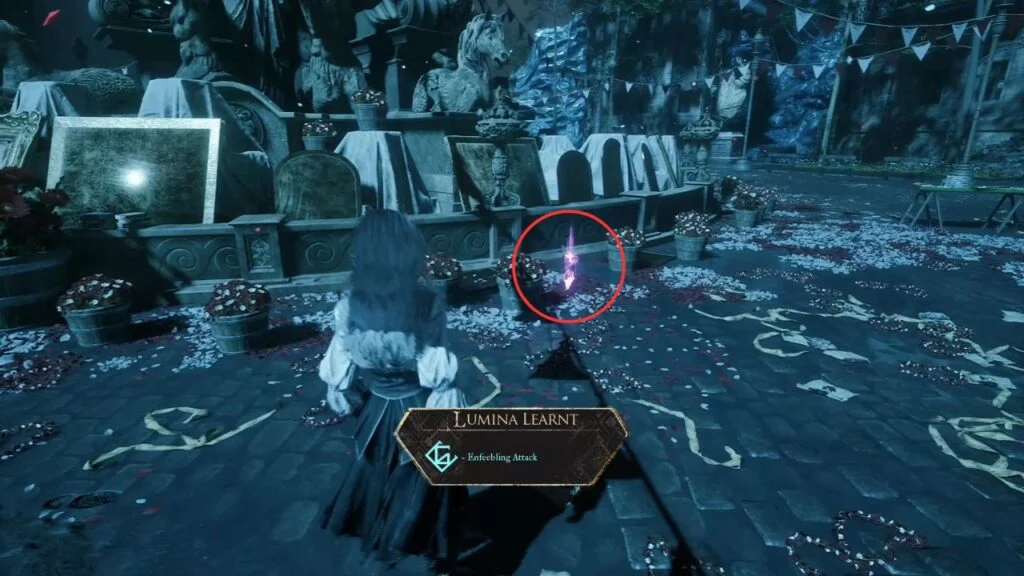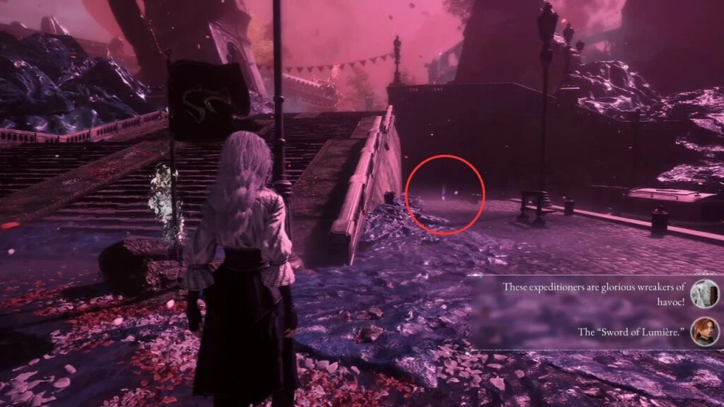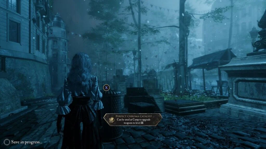 Drop down from the rooftops via the magic rope. This area introduces Lumière Citizens as a new enemy type. Two groups are here, kill them both for Weapon – Liteso and Weapon – Litheson. Grab the Resplendent Chroma Catalyst just behind the fountain.