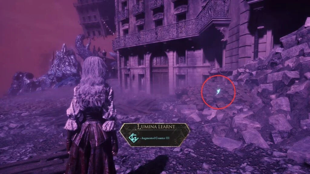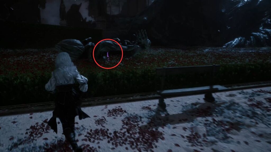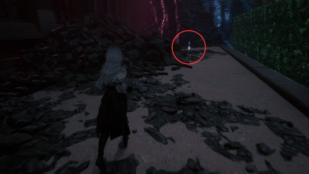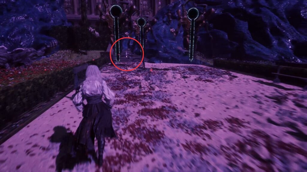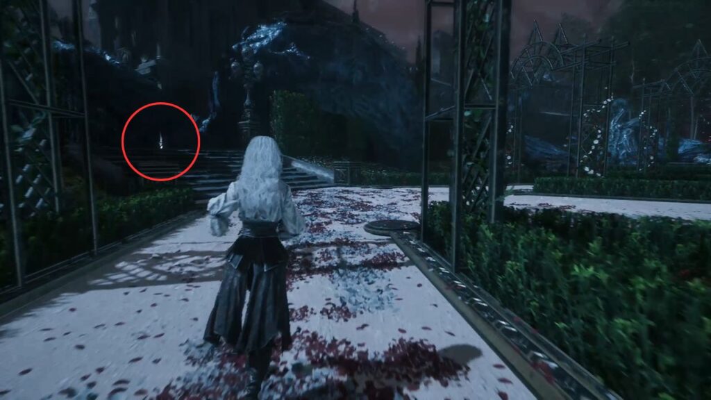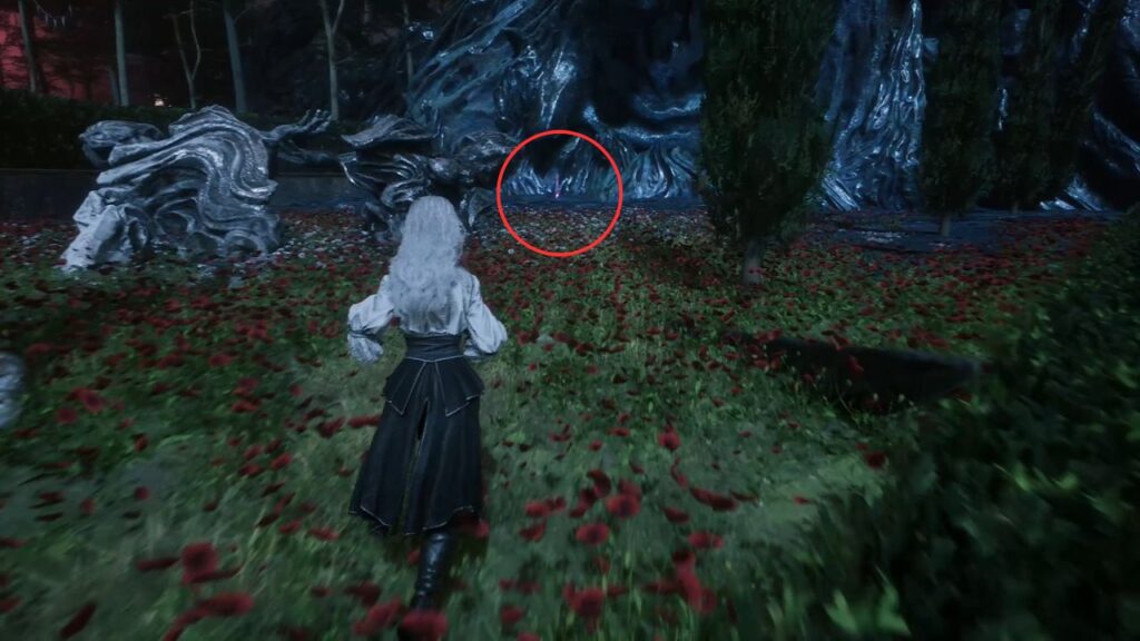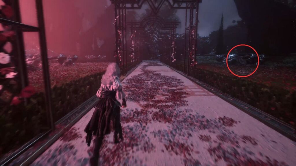 Go back down and proceed through the left arch. Find the statue in the middle of the garden on the right, there’s a Recoat behind it. Continue along the path. Three Aberrations spawn on the left, kill them, and grab the Colour of Lumina they were guarding.