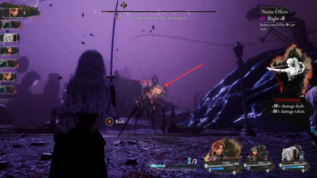 Before this fight, make sure Verso has both Burden and Purification equipped. The boss applies Inverted at the start of the battle, which turns all healing into damage, a death sentence if left unchecked.