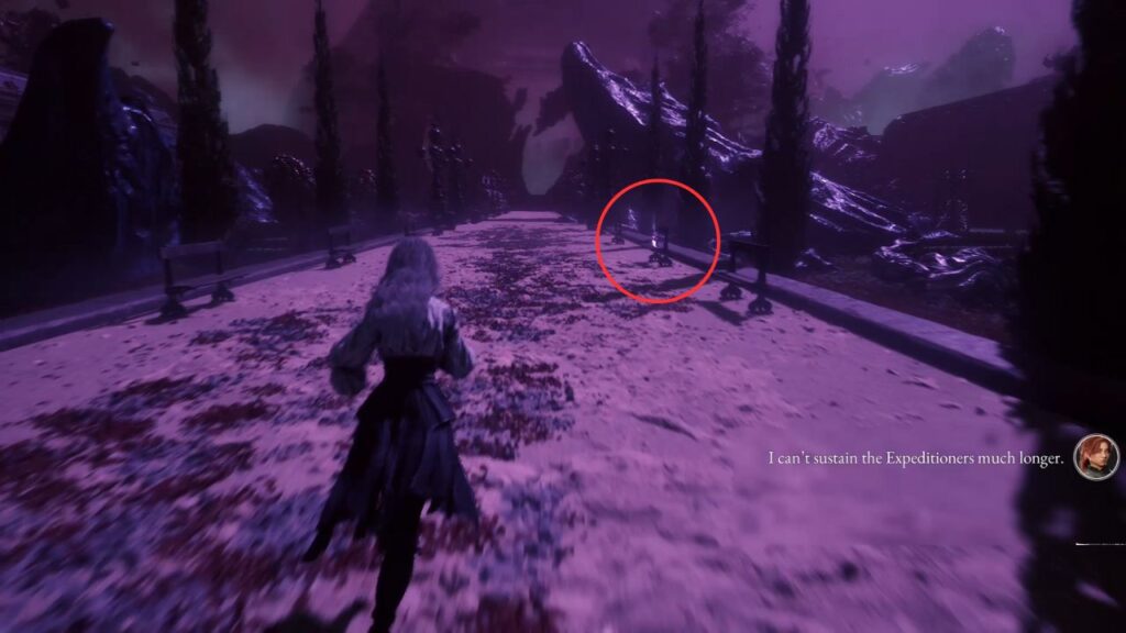 After the flag, take the first left turn and go to the end, there’s a statue of a Clair Obscur with a Recoat at its base. Follow the main path and check the benches on the right for another Recoat.