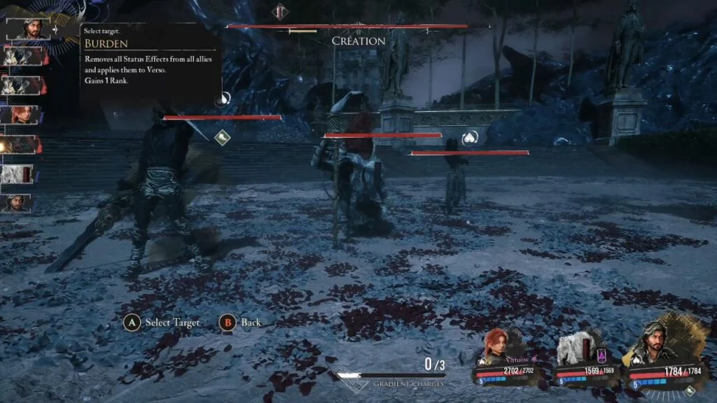 Burden pulls all debuffs from your allies onto Verso, and Purification wipes them clean. Alternatively, Energising Cleanse Pictos converts the debuff into AP instead.