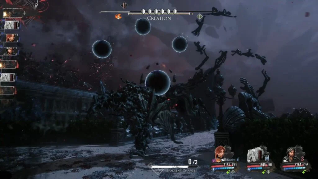 At around 50% health, the Création takes to the air and summons three Void Orbs and six shields. Inverted gets reapplied here. One Void Orb detonates at the start of each of the boss’s turns, then it uses one of two patterns: