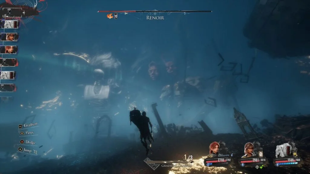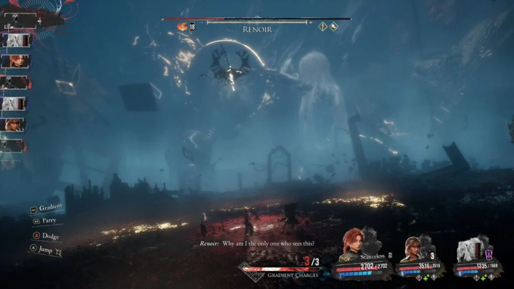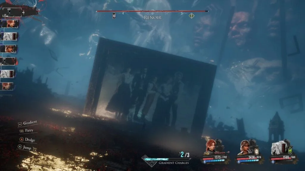 At 50% health in Phase 2, Renoir flies around the area and unleashes a devastating sequence: flies left and swipes right → immediately swipes back left → launches a Chroma Meteor → ground slam. Time your parries as the Chroma glows before each hit.