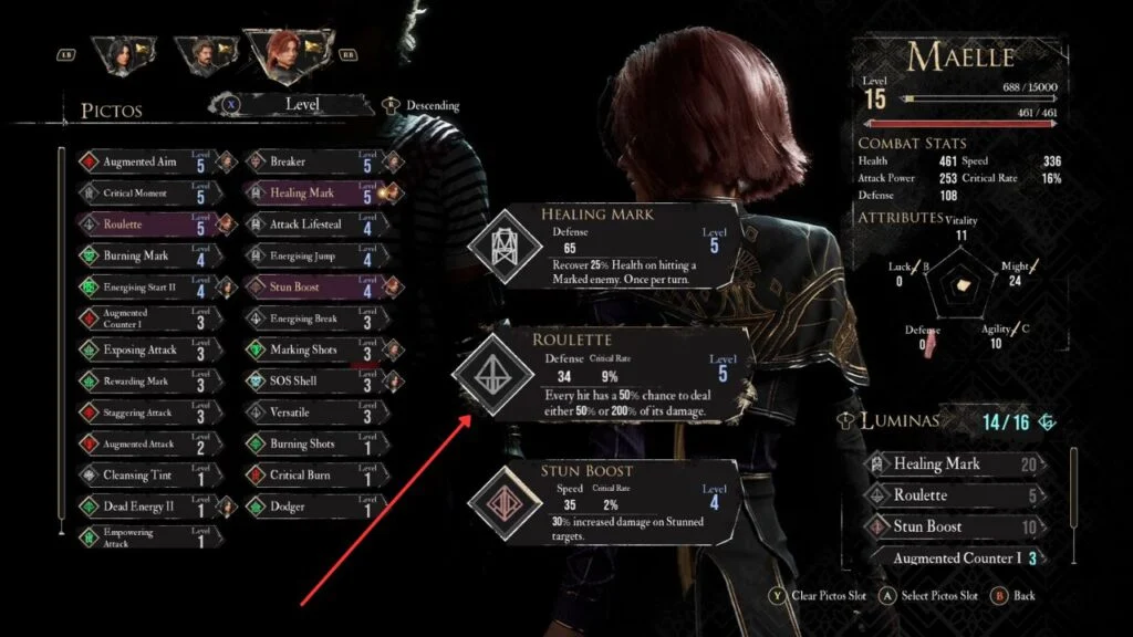 At the Casino, interact with the door. The Gestral inside asks you a question, answer with “I don’t care” and he gives you Pictos – Roulette. If you like RNG-based gameplay, this is actually a strong Pictos for Maelle.