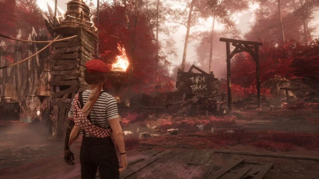 Near the trader, there’s a “Turn Back” sign. Ignore it and go through, this path leads to the Manor door.