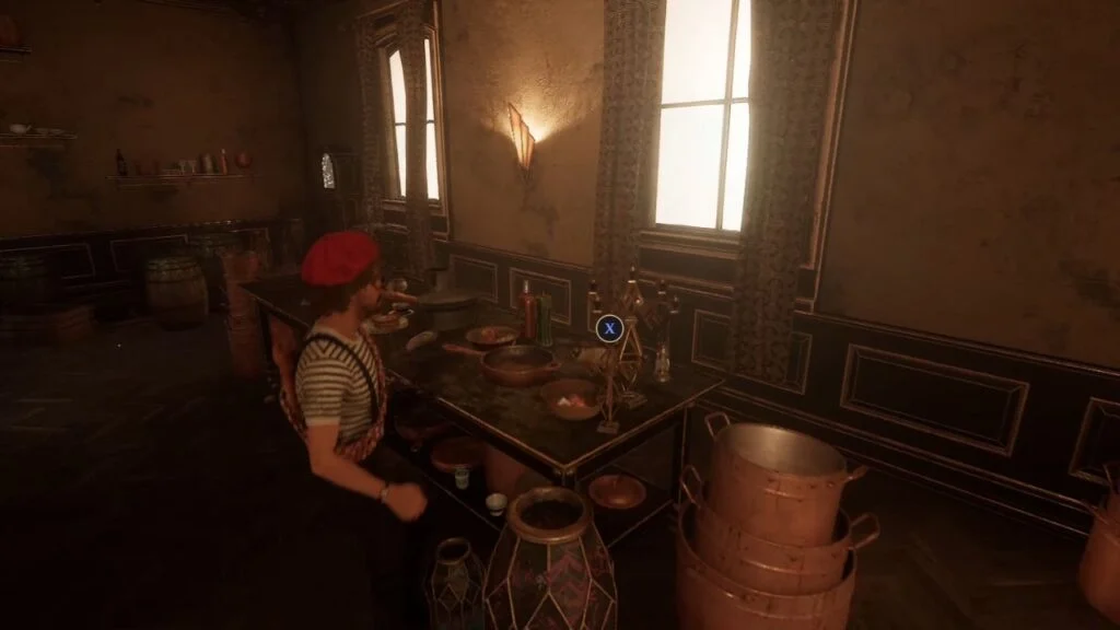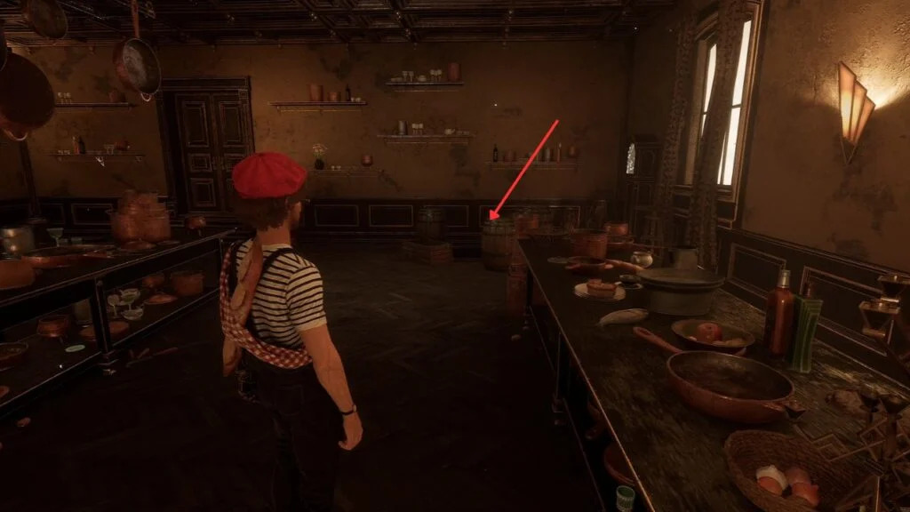Find and activate three hidden objects in this order: the Roman statue on the right side of the door, the middle pan of the three pans hanging on the wall, and a spinning candelabra on the left table. Once all three are activated, a grate in the floor near some crates by the entrance opens up.