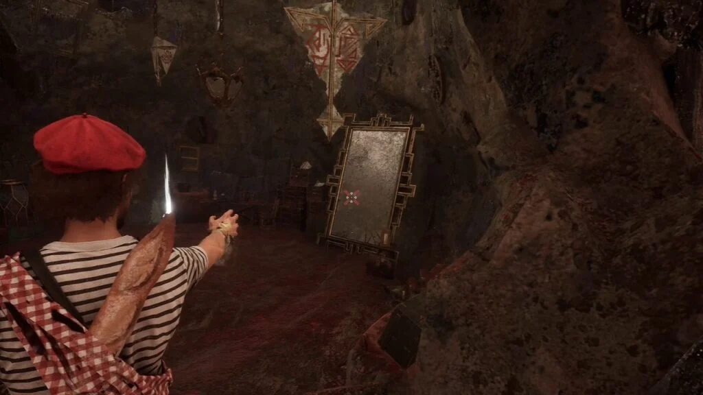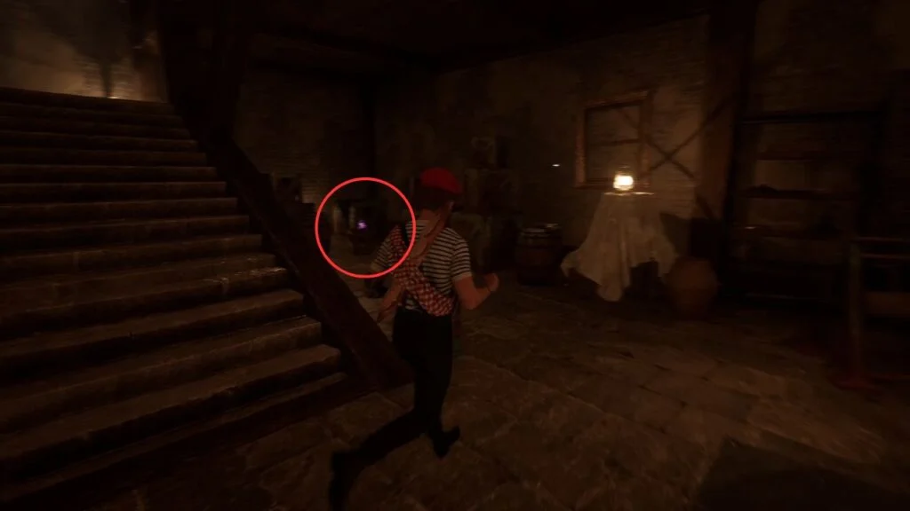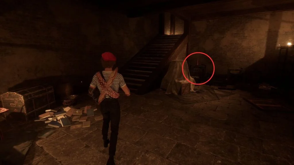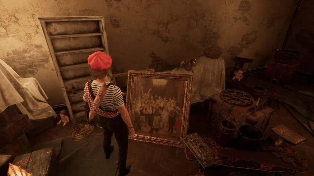 Head up those stairs to a locked room. There’s a picture on the floor showing a group of people, likely an Easter egg featuring the game’s developers. Nothing else to do here, so head back through the crawlspace, up the stairs, through the kitchen, and out the main door.