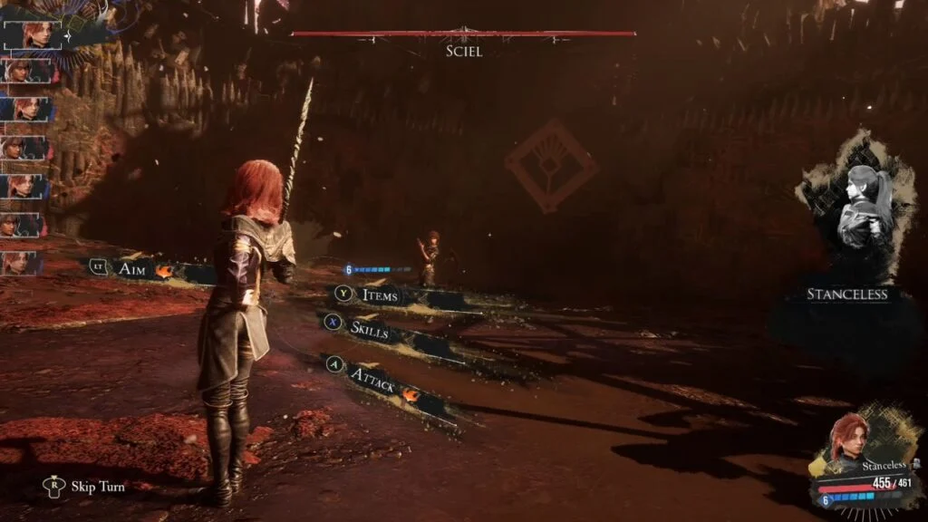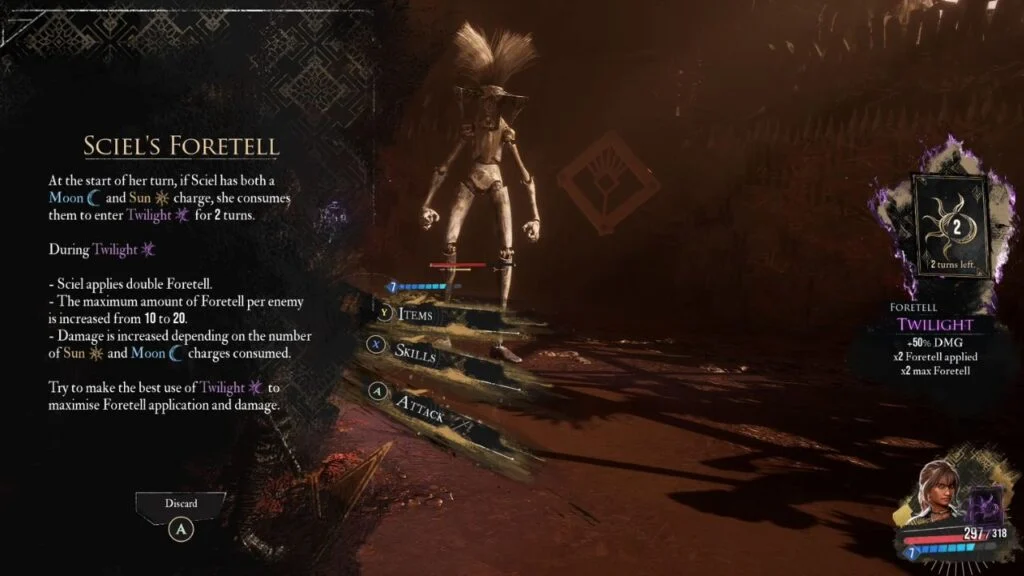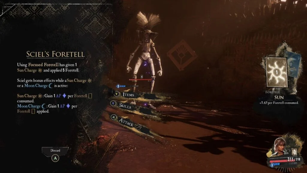 You get a tutorial battle to learn how Sciel plays. Her system is built around her Scythe and the Foretell ability.