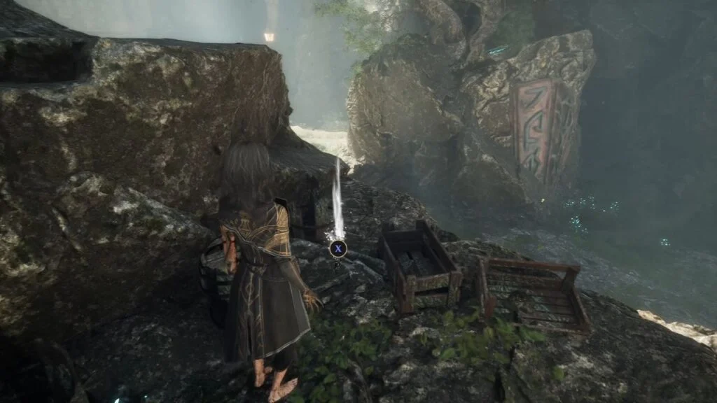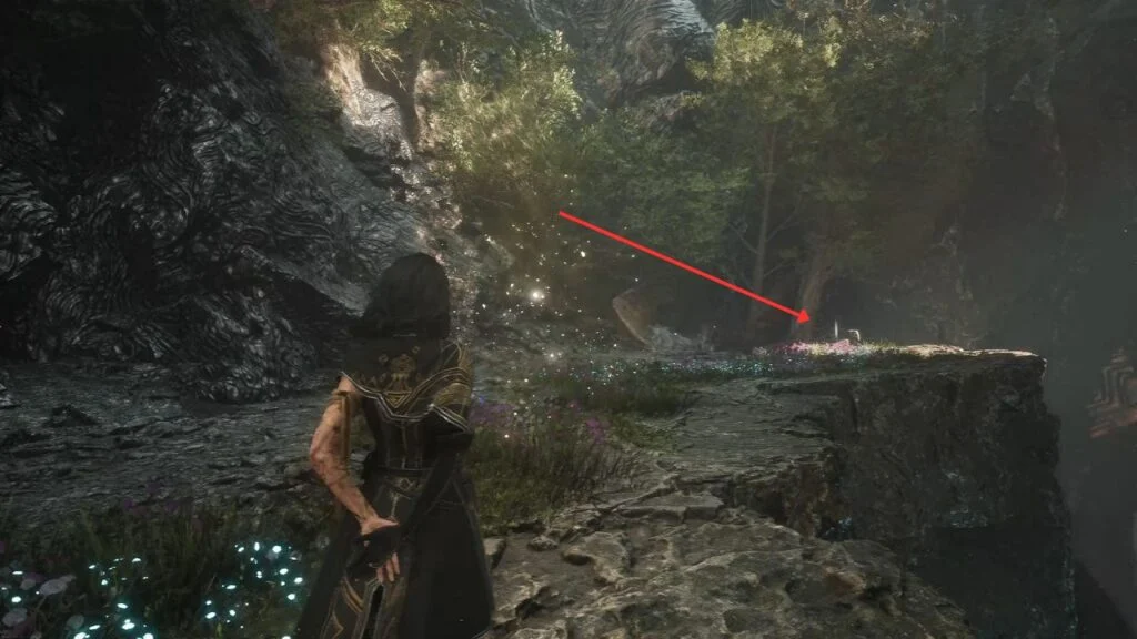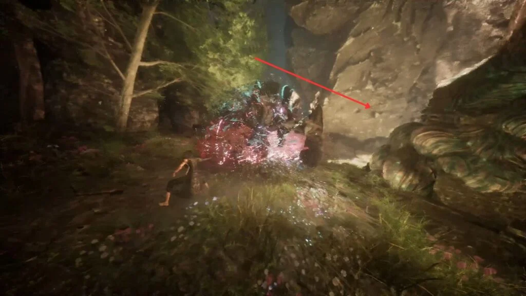 Use the grapple points to move forward. There’s a group of enemies on the right side guarding Chroma x180, kill them and grab it. Follow the main trail to a climbing wall, go up, and enter the cave.