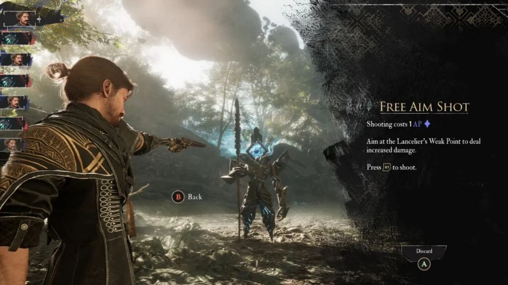 Walk into the clearing, and a cutscene plays, then you fight your first enemy: a Lancelier. This fight introduces free aiming, hold L2 to aim, and shoot at the glowing weak points on the enemy. Each shot costs 1 AP, so don’t spam it mindlessly.