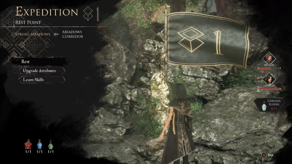 Follow the main path and open the Expedition Status UI when the game prompts you. It shows your current objective, a compass, your party’s health, and how many Chroma Elixirs you have left. Elixirs are your healing items. They’re limited, but refills every time you rest at a camp.