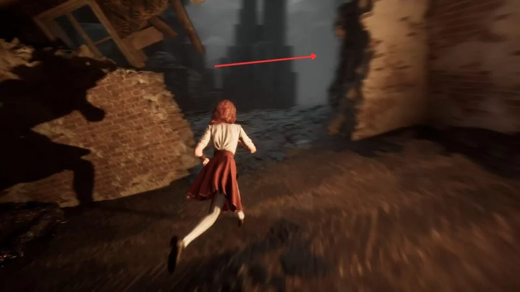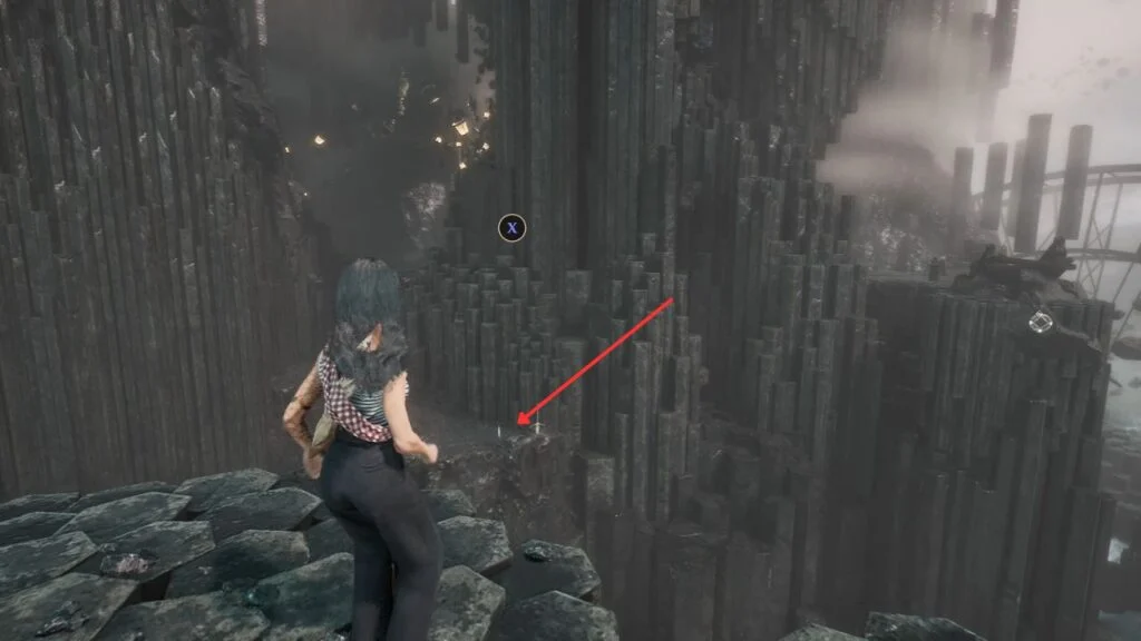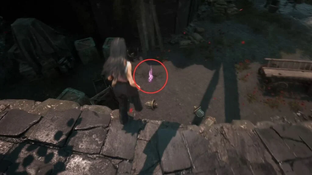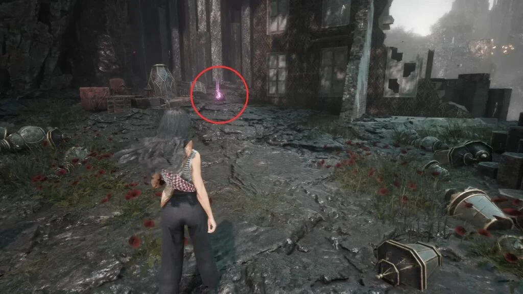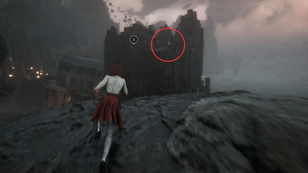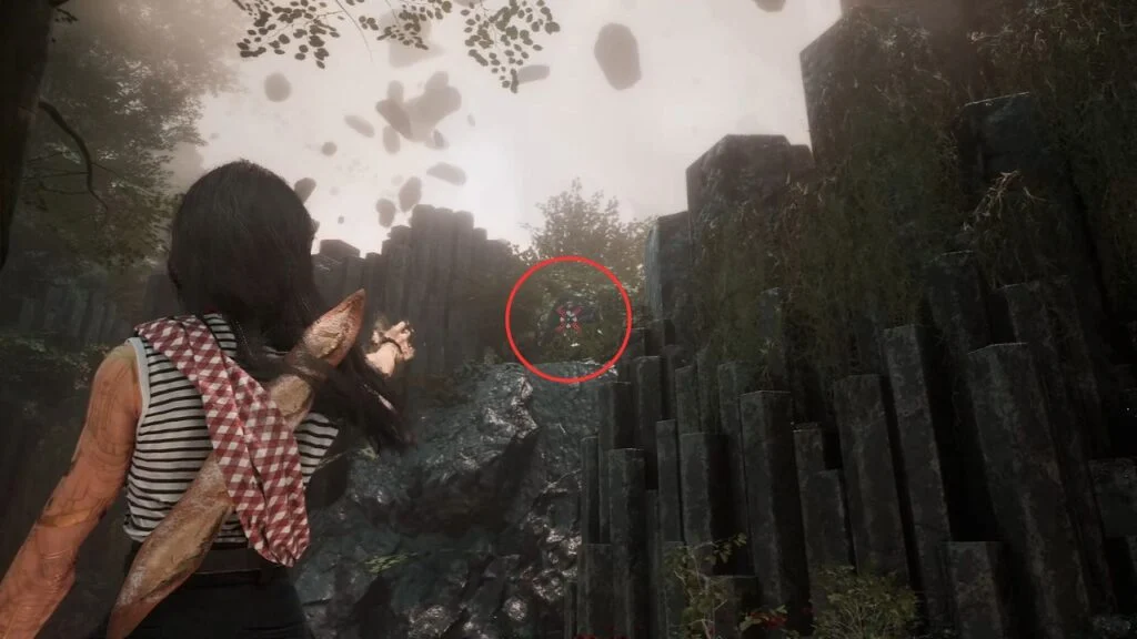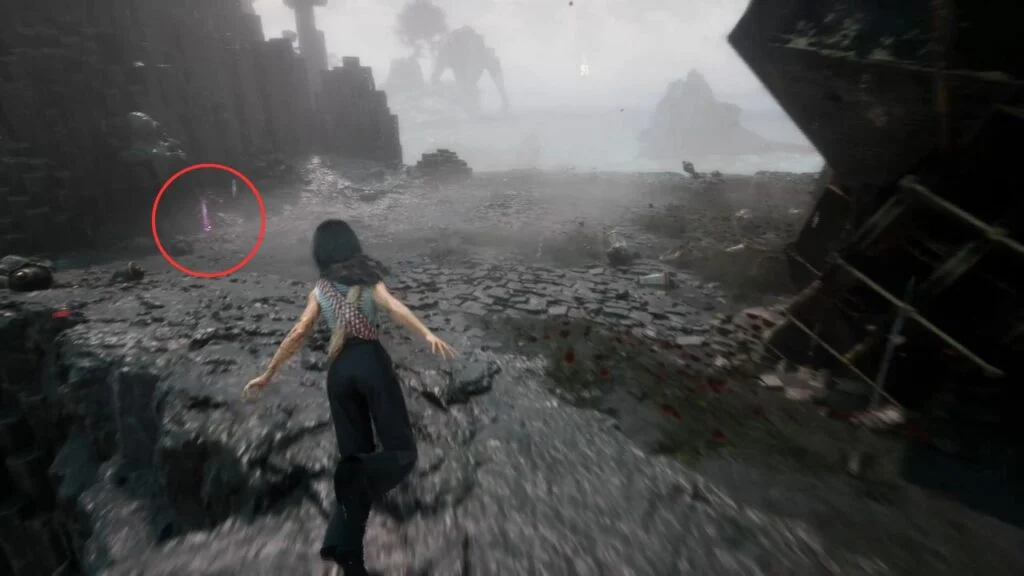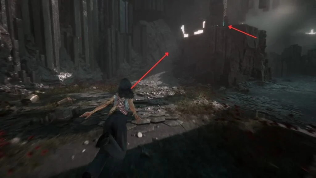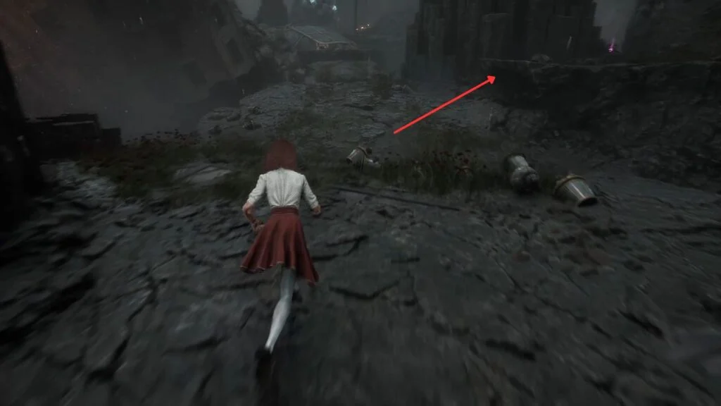 Go through the door and down the stairs. Head outside and kill the patrolling Rocher. At the path split, enter the building on the left first. Exit from the upper floor and use the handholds on the right wall to climb down to a hidden area with a Revive Tint Shard.