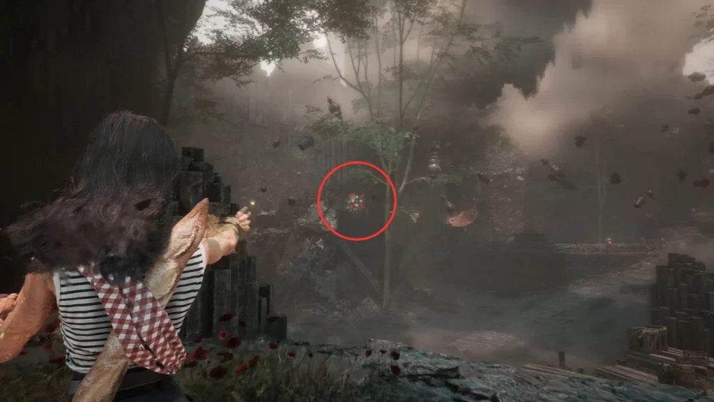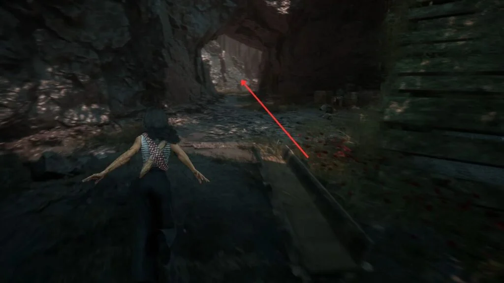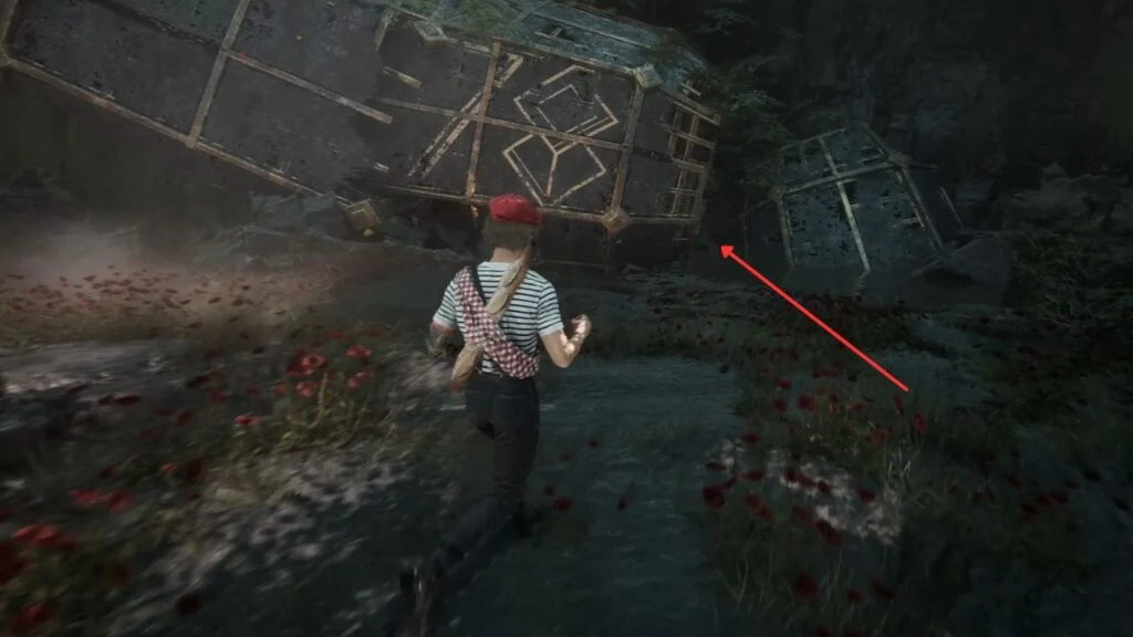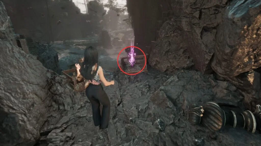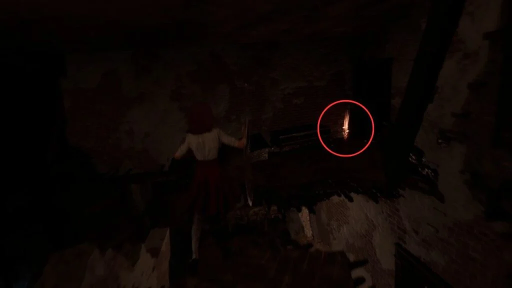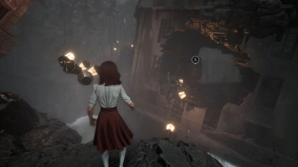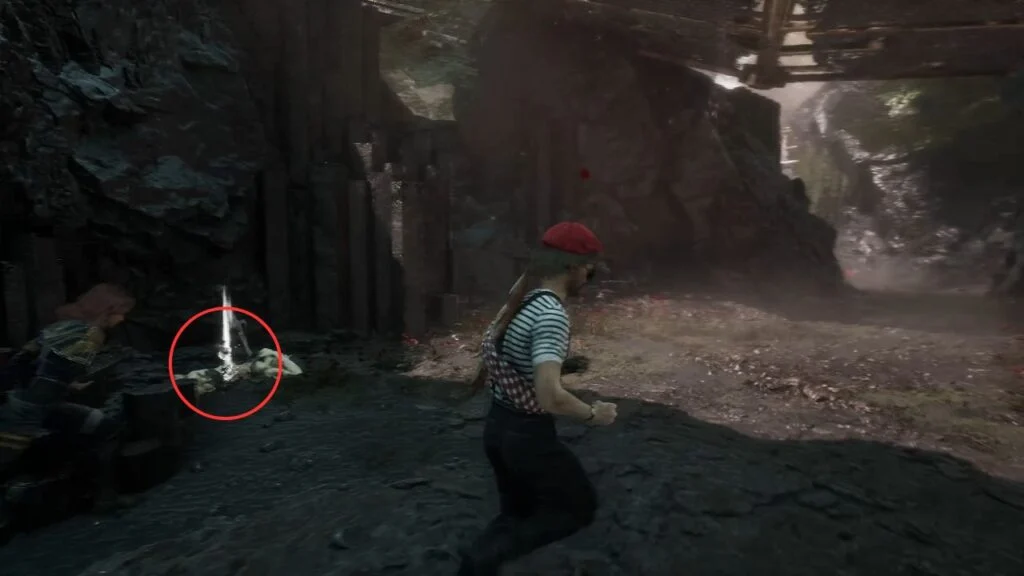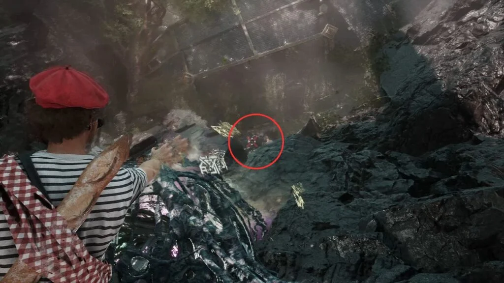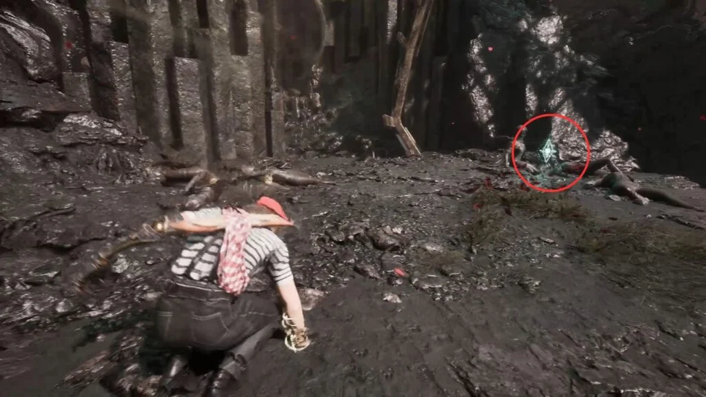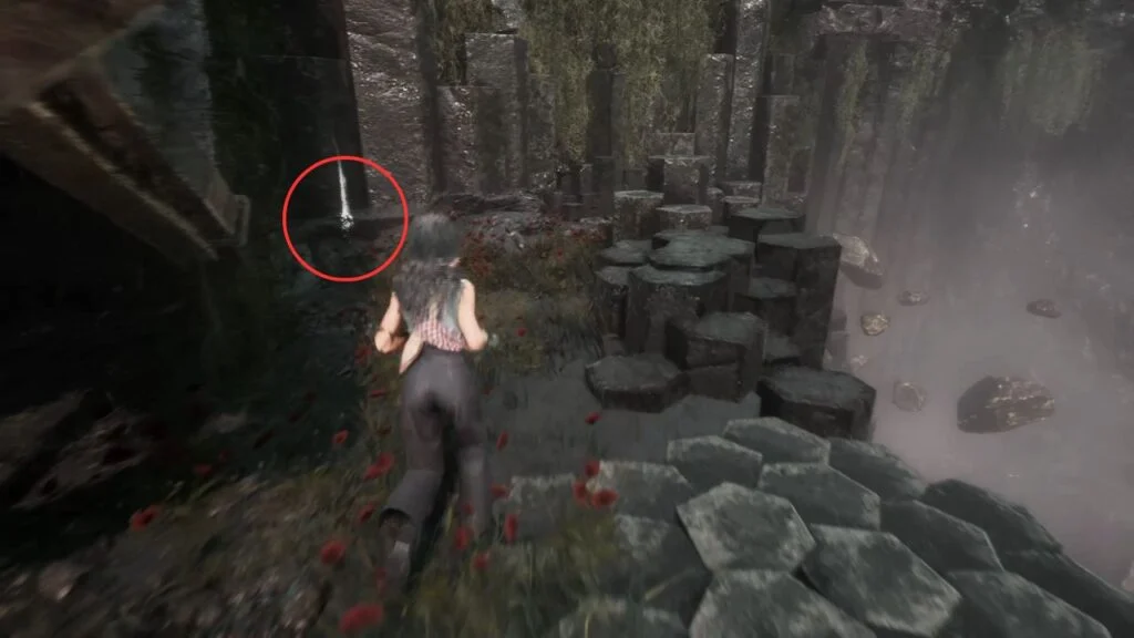Go through the door and down the stairs. Head outside and kill the patrolling Rocher. At the path split, enter the building on the left first. Exit from the upper floor and use the handholds on the right wall to climb down to a hidden area with a Revive Tint Shard.