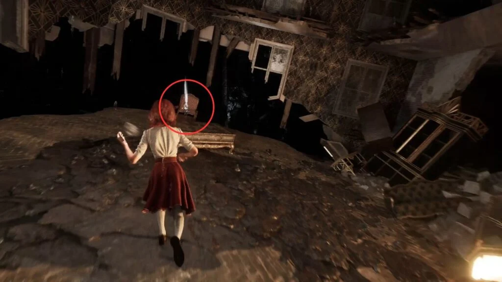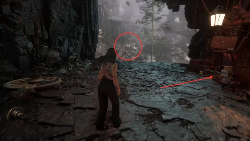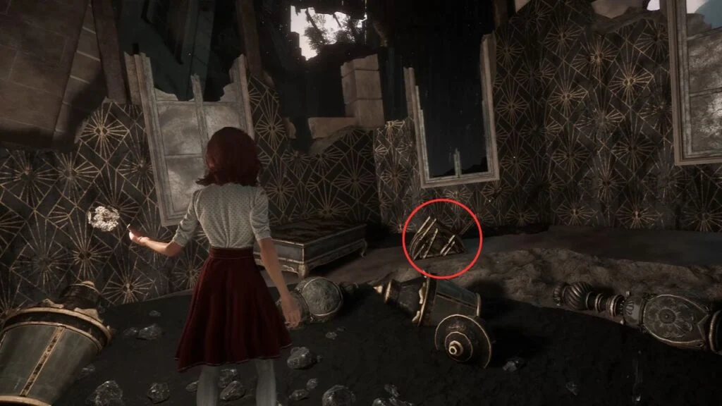 Before heading up, check the destroyed building on the left. Find the lever beside a table on the far side and pull it to open the door. Go upstairs and turn right for Chroma x3,160.