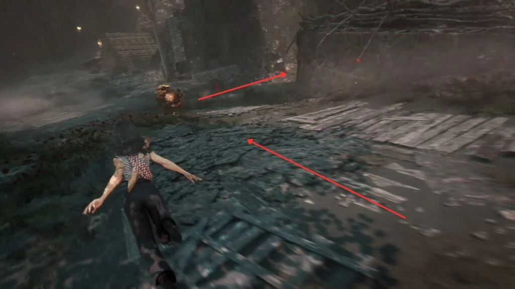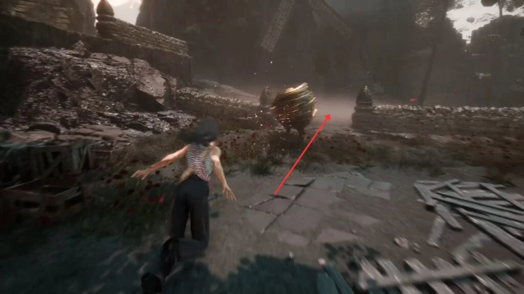 Chase the Pétank out of the yard and follow it down the slope. Take the first side passage on the right to keep tracking it. Inside, there’s a cracked platform where the fight happens.