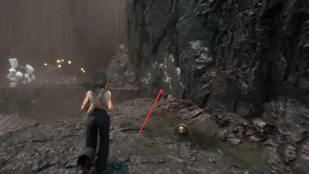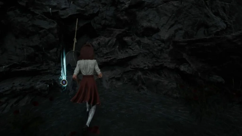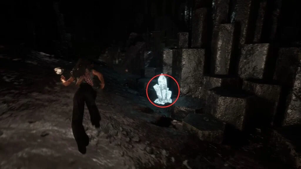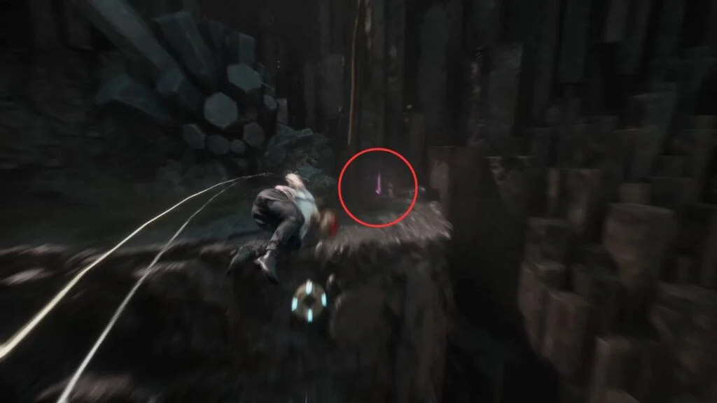 Follow the cave path and grapple through the gap. Use the magic rope to descend deeper into the cave. Kill the patrolling enemies first, then find the three Rock Crystals for the Hexga’s quest.