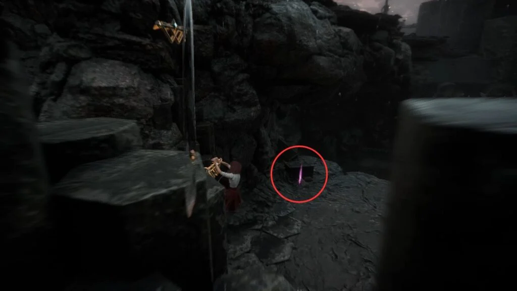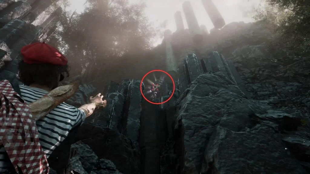 Further along, defeat a Hexga and its allies, then check the nearby impaled corpse for Pictos – Healing Tint Energy. Use the magic rope ahead to enter the building above. Go through the second door and immediately look left, there are handholds leading to Lune Weapon – Coralim.