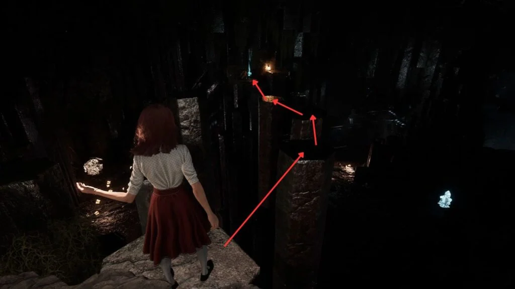 Head back into the cave and down the magic rope. Take the path with flower petals on the left, near where you found the first crystal. When the path splits, go right and parkour across to find Pictos – Breaking Shots.
