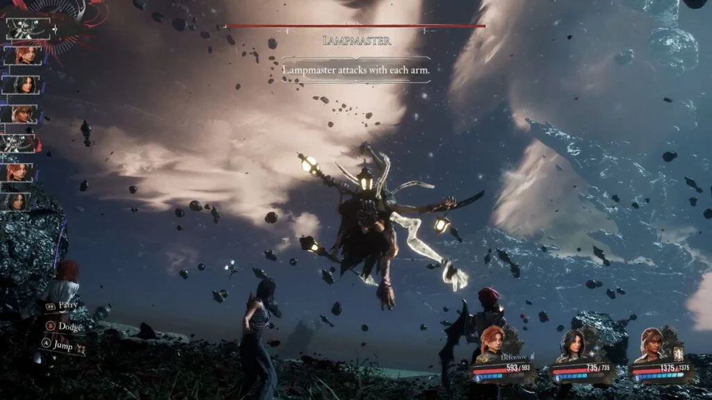 Phase One: It has three main attacks to watch for. The Jump Attack is a leaping spear slam, read the windup and dodge. Light Projectiles trigger when the lights go out, four quick projectiles come in succession, so be ready to dodge. The Lamp Power Attack hits the whole party and is the most dangerous counter when you see the purple flash.