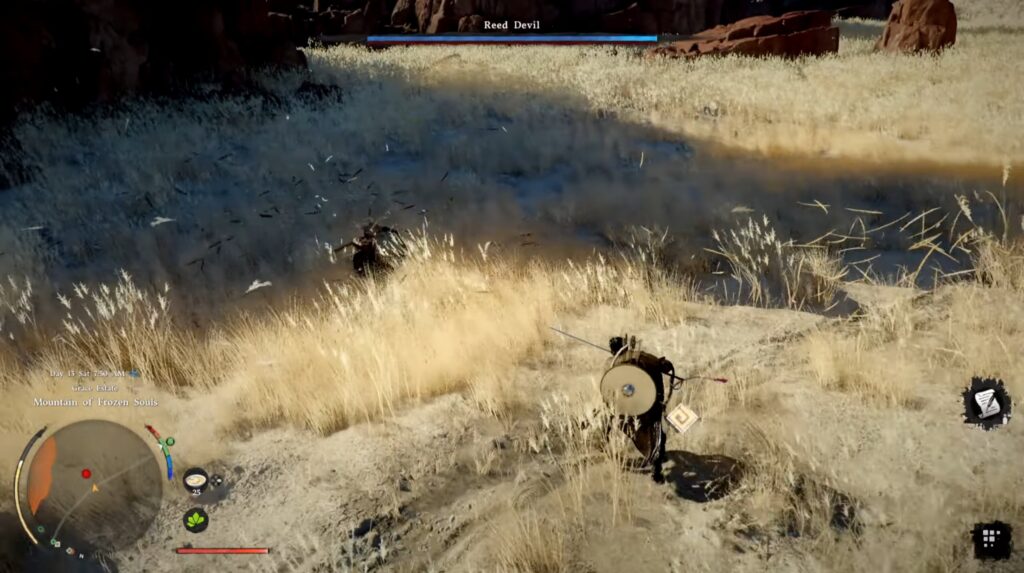 – As a quick tip, the fighting along the way is actually optional! Your goal is simply to get to the reed fields. The boss, despite his health bar, is unbeatable right now. Fight if you want, but you need to make sure you have plenty of food stocked up for the actual boss fight ahead!