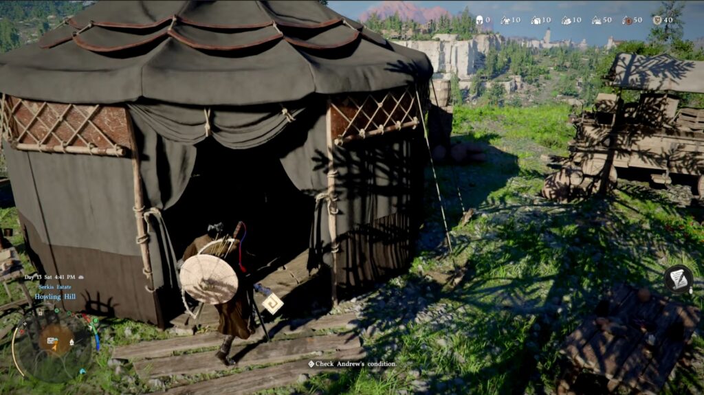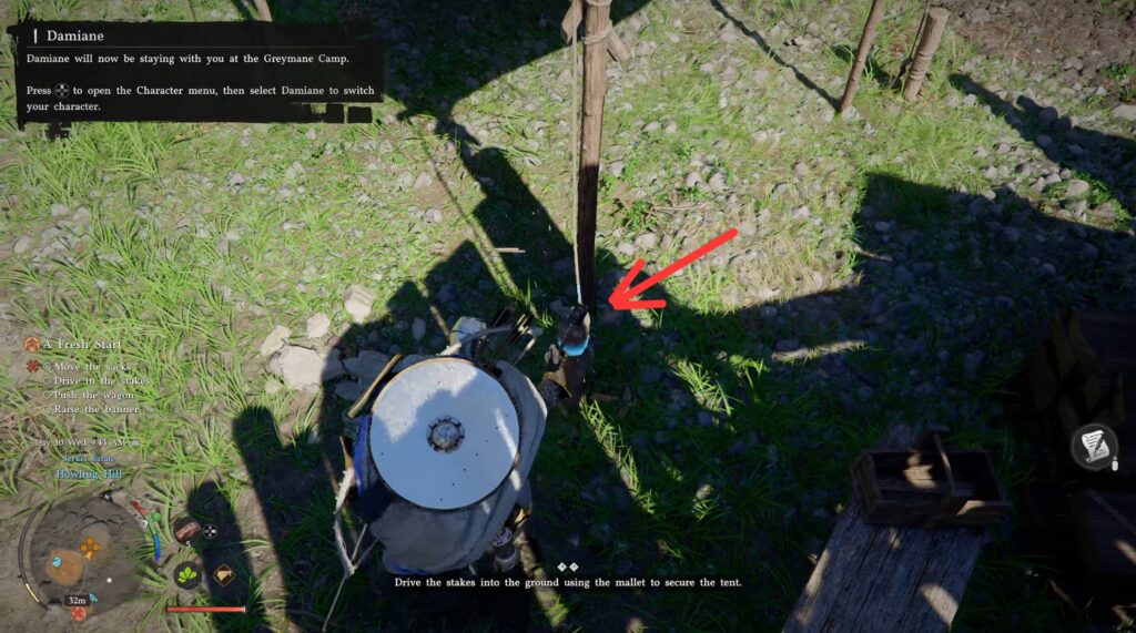 Finally, head over to the tent that needs to be anchored down. There is a table with a mallet on it. Pick it up and equip it like the pickaxe. Aim with L1 and line up your hits with the tent corner and attack to drive it in until the icon turns red. Do this for all 4 corners to move to the final step!