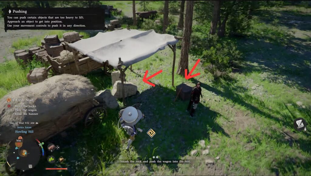 With that complete, make your way to the wagon. You need to mine the rocks in front of it first using a pickaxe (one is conveniently placed next to the rocks). Equip it and swing at the rocks to mine/break them. This clears the rubble so you can push the wagon into place.