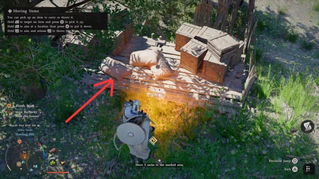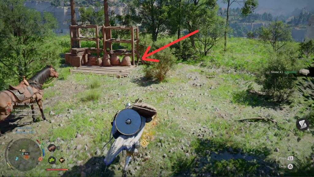 Next, you have to take care of some chores to prepare your camp. You can start by moving the 3 sacks. They aren’t marked, but it’s these 3 sacks on the pallet: