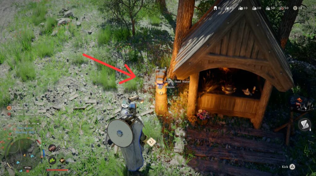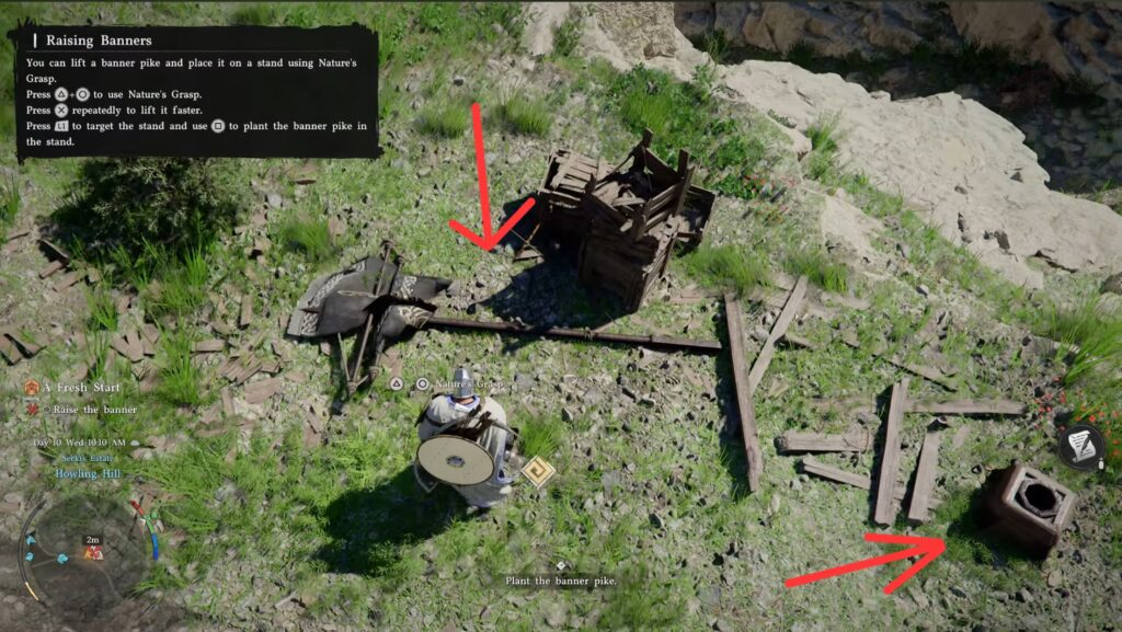 You will be directed to a flag on the side of the road at the entrance. Pick it up using nature’s grasp and bring it to the flag stand. From there, you can place the flag in the hole to secure your camp.