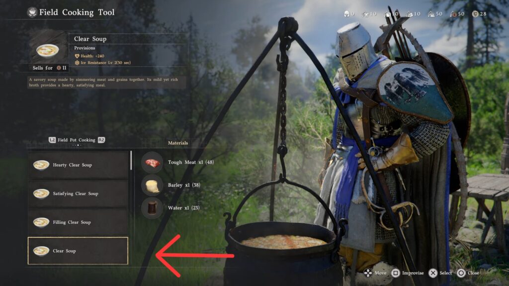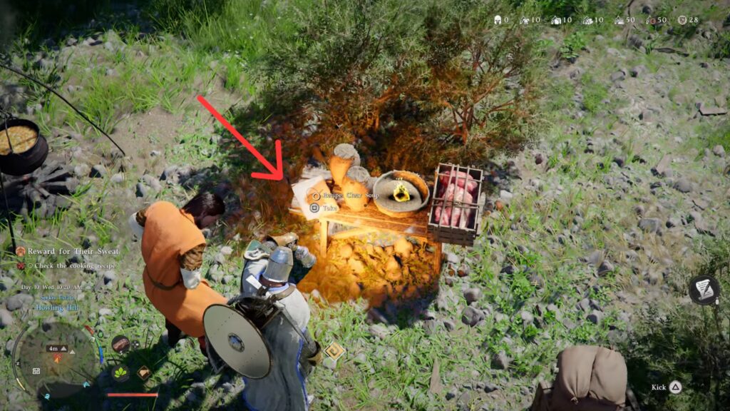 Before this camp is ready, you have to feed everyone. At the marked campfire, grab the paper from the table and read it to learn the “clear soup” recipe. The ingredients for the soup are conveniently placed on the same table. Head to the fire and cook up some clear soup!