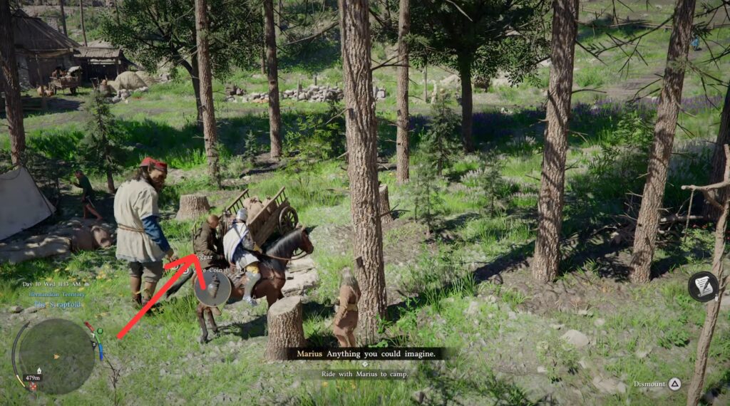 Now that camp is all set up, head back to town and find Marius again. Summon your horse and hop on, then Marius will climb aboard with you. Ride him to the new camp to complete part 1!
