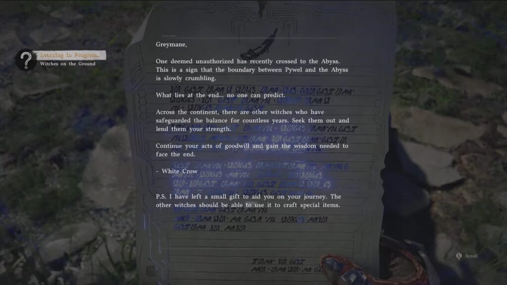 Right after speaking to Damiane, you can open your inventory and read the White Crow’s letter. You already picked it up earlier in the game, but now that the seal has broken, you can finally read it. It gives you a few materials and directs you to a new objective.