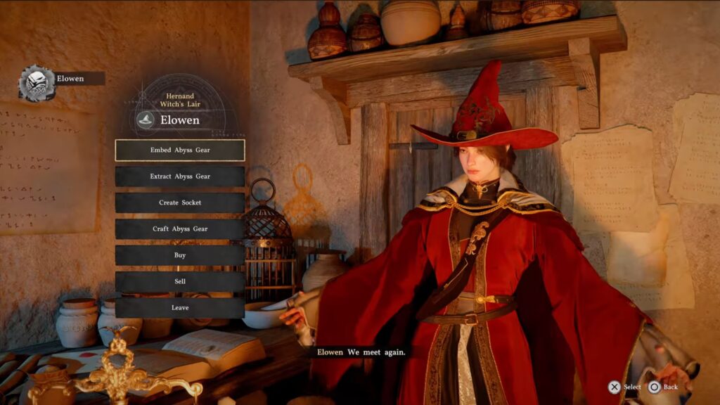 Untie the woman inside. Your kindness earns the trust of the witch (Elowen), allowing you to enter her store. Head to the neighboring building, where you can begin modifying your weapons and armor with special Abyss Gears. Those random ingredients you got at the start of this quest will let you craft one for free.