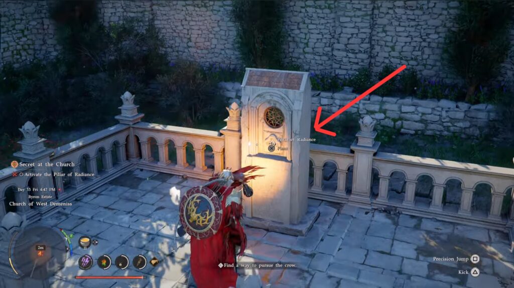 Once you talk to the woman, she sends you on a quick errand to grab a relic. The relic is hidden in a small bunker beside the church. Open the door to the stone shed and hop down. Inside is a puzzle (the same kind as in Chapter 4).