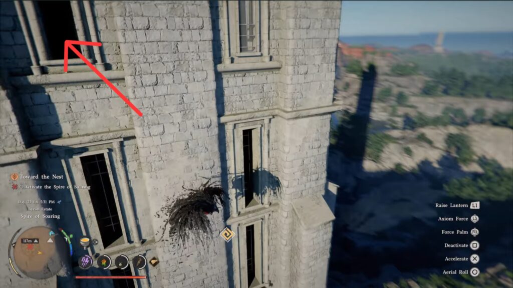 Alternatively, you can have some fun and climb the tiny windows, resting for stamina by standing in the circular holes. As you reach about midway, a window will open you can climb through.