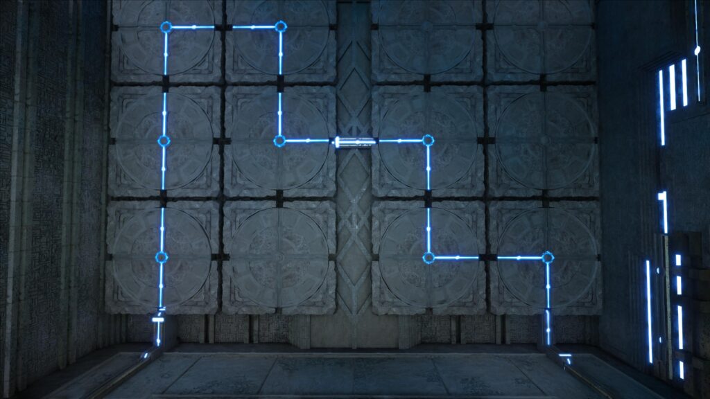 Climb inside, or glide up the tower if you came from the cave. Now it’s time for, you guessed it, more puzzles! The platform needs to be raised, so use your grapple to rotate the circular objects on the wall. You want to line up the blue power on the floor with the hidden circuits on the circles. If you want to see the solution, the next image shows the final product: