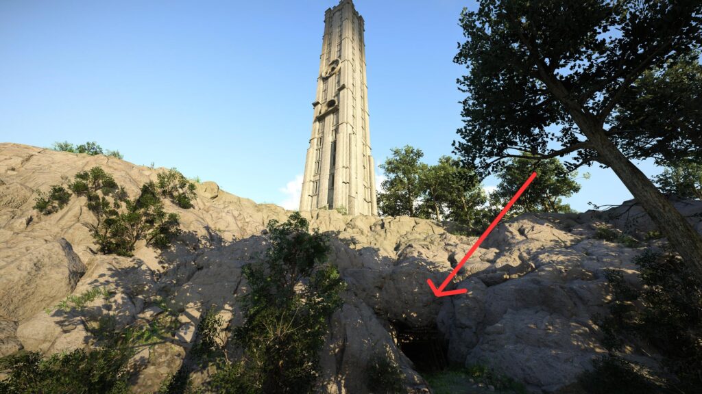 Now you can head towards the huge tower! Once you arrive, you can’t simply walk through the front door. There’s a small cave in the ground around the base of the tower.