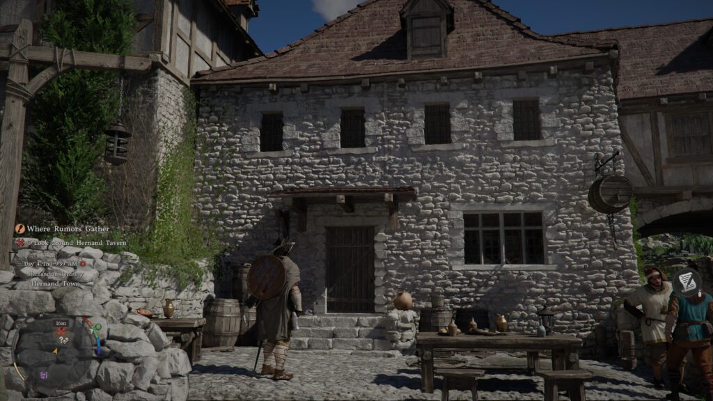 As soon as you start, exit the camp and make your way into town. Use the mini-map to move towards the tavern, marked with the red X icon.