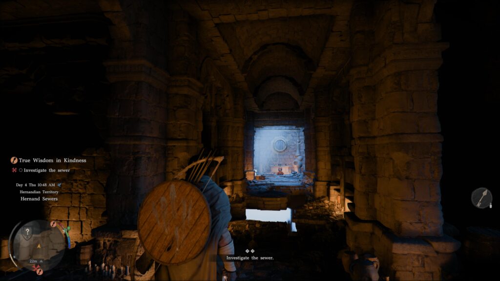 There isn’t much to “investigate” here like the mission implies. Just hop across the platforms and approach the woman to “save” her. You can turn around and leave the sewer right after.