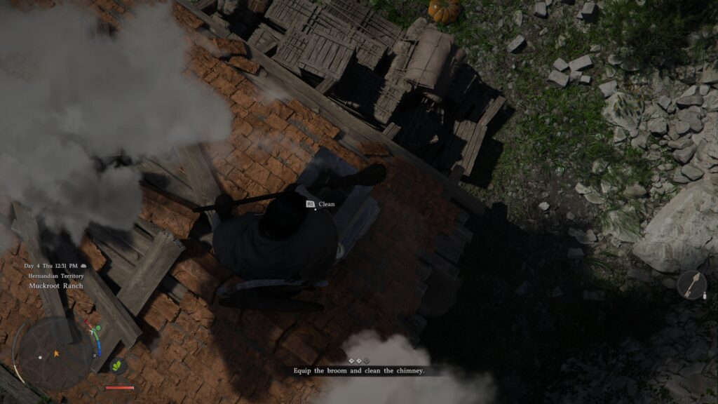 Next, follow the minimap to the town below the city. You will find a man who just fell off the roof who needs your help to clear the smoke from the chimney. Grab the broom next to the door and climb onto the roof to clear the chimney.