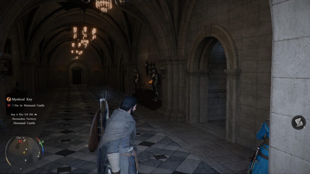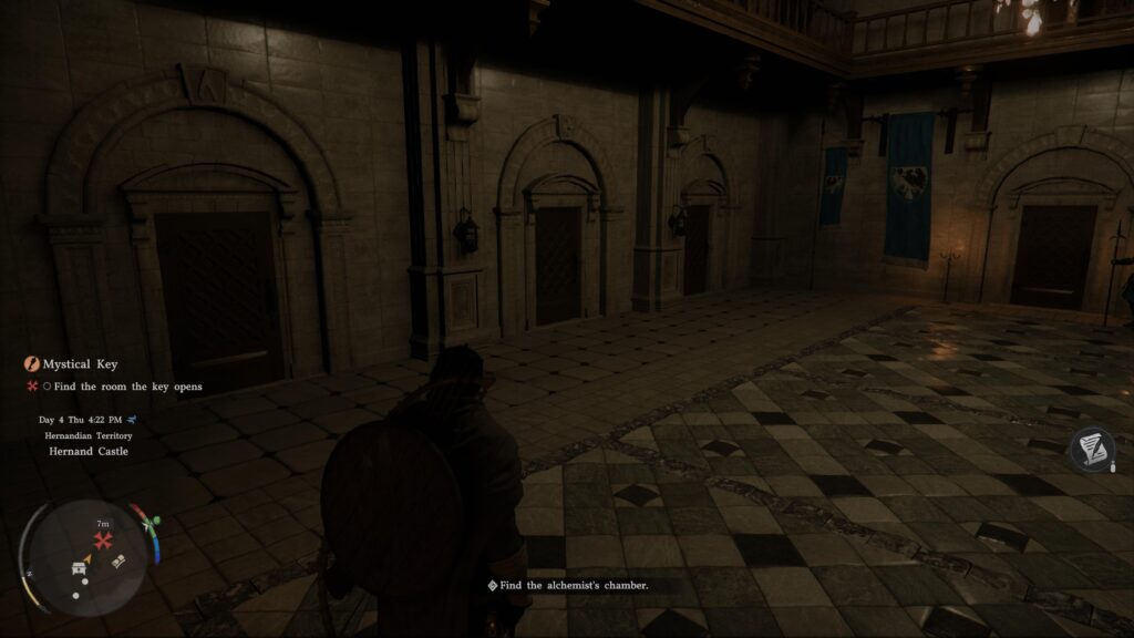 Now you can head into the castle. Once inside, don’t worry about going into rooms (most of them are locked anyway). Instead, take the staircase to the right and go up a floor.