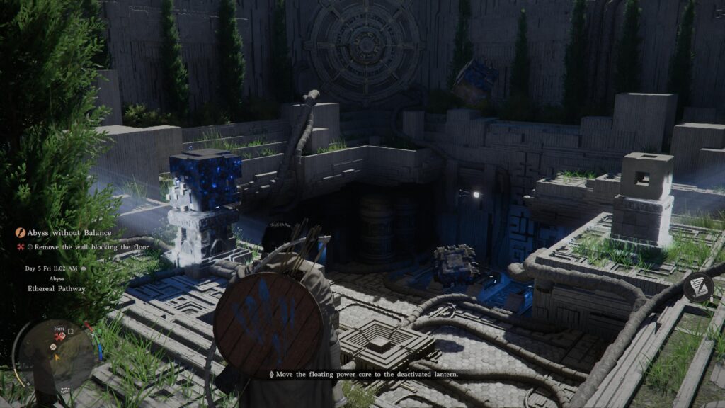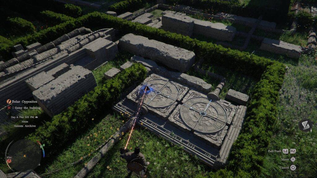 Once in place, you can walk to the glowing blue figure. Hold L1 and observe to unlock a new ability. Hold R3 to use the new ability and push the object into place. After the animation plays, head to the left of the object you just placed. A textured portion of the wall allows you to climb out of the hole.