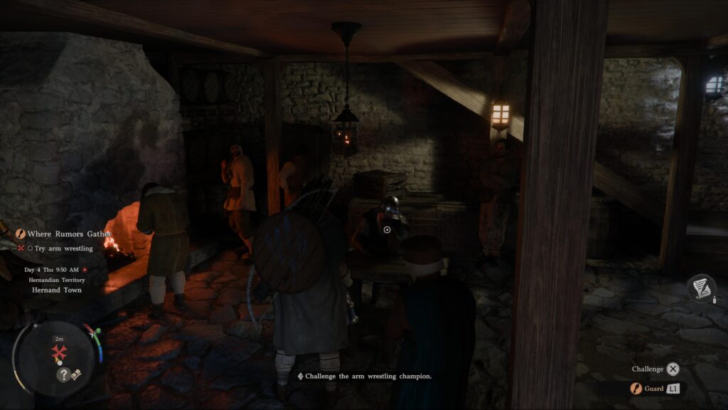 Once at the tavern, head inside and approach the guard seated at the table. Hold L1 to interact with the guard, then press X to challenge.