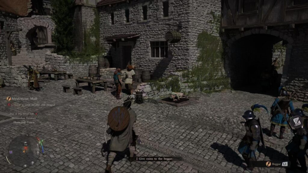 After the cutscene, head outside towards the next objective. A beggar will be lying on top of a sewer hatch. Approach him, hold L1, and give him a coin. Doing so will trigger a cutscene. Afterwards, he rewards you with a random key for your kindness.