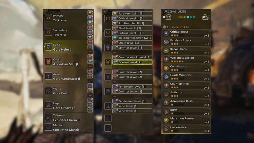 The 4-piece Gore set remains one of the strongest armor choices for Dual Blades heading into endgame. It provides full Weakness Exploit, Counterstrike, and Antivirus, all of which contribute to maximizing affinity and sustaining status buildup damage.