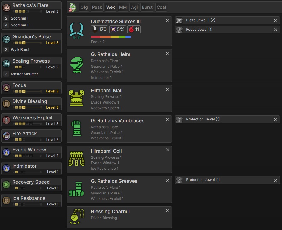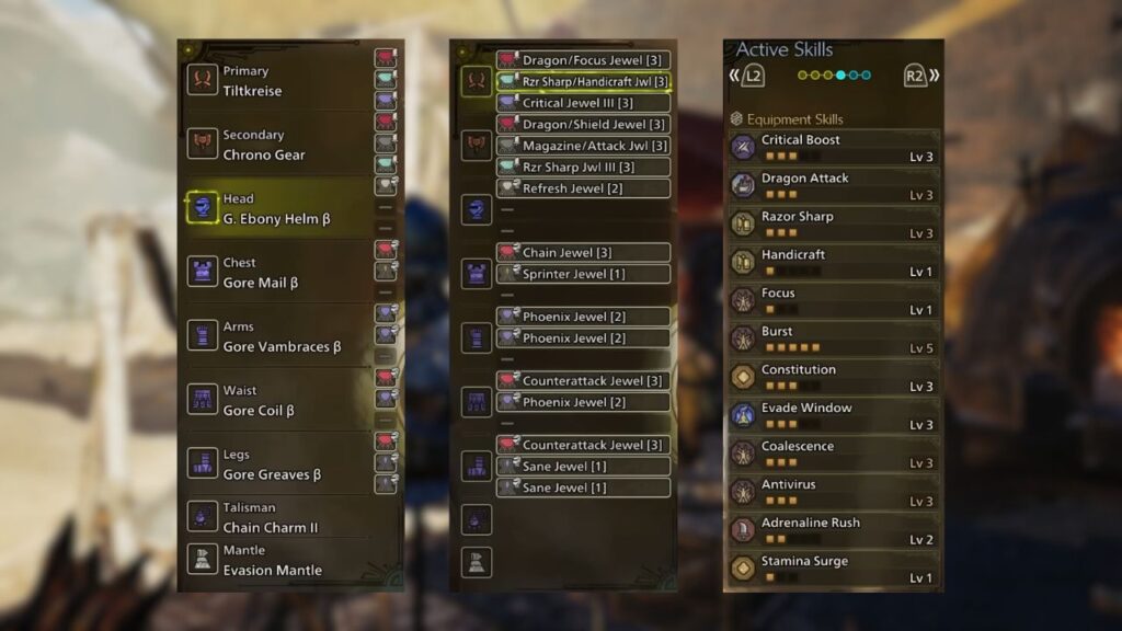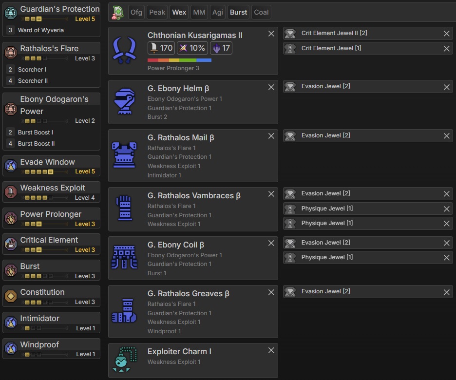 This build retains the 4-piece Gore set as its foundation, with the final armor slot switched to the G. Ebony Helm. This adjustment shifts the build’s focus toward Burst rather than Weakness Exploit, as Burst provides a significant boost to elemental damage, an essential skill for this particular setup.