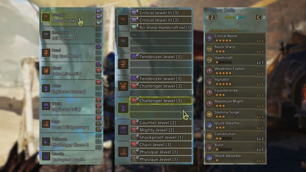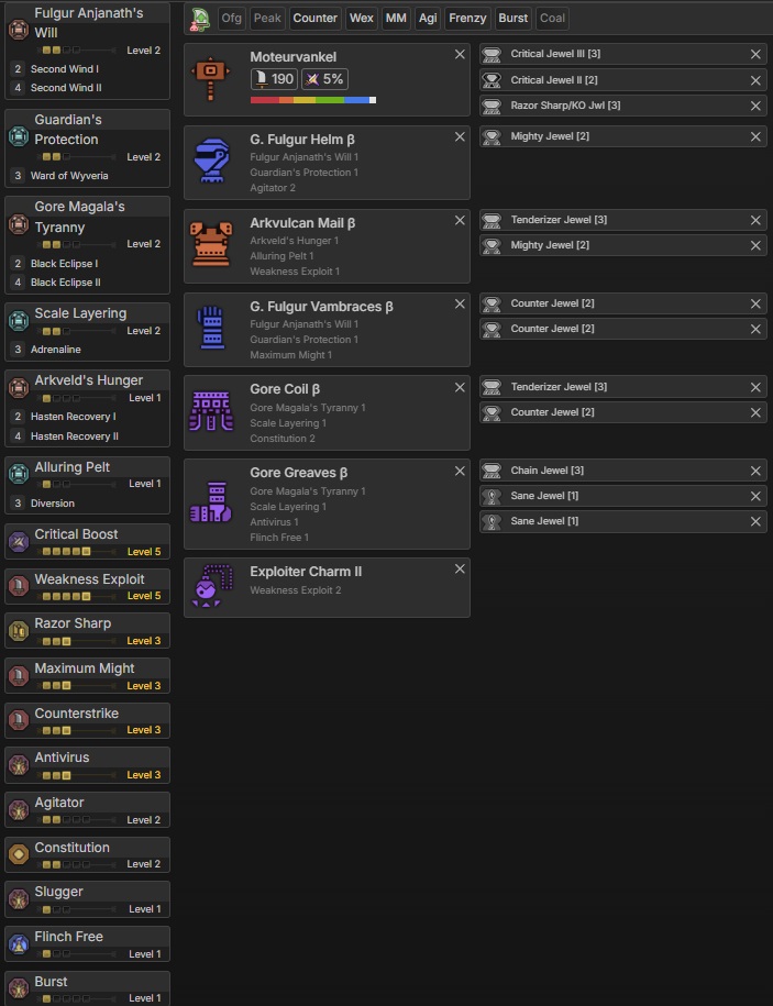 This build retains the core damage skills from the previous setup, full Critical Boost, Weakness Exploit, Counterstrike, and Maximum Might, while adding full Agitator, Stamina Surge, and Quick Sheathe on top, along with improved overall defense.