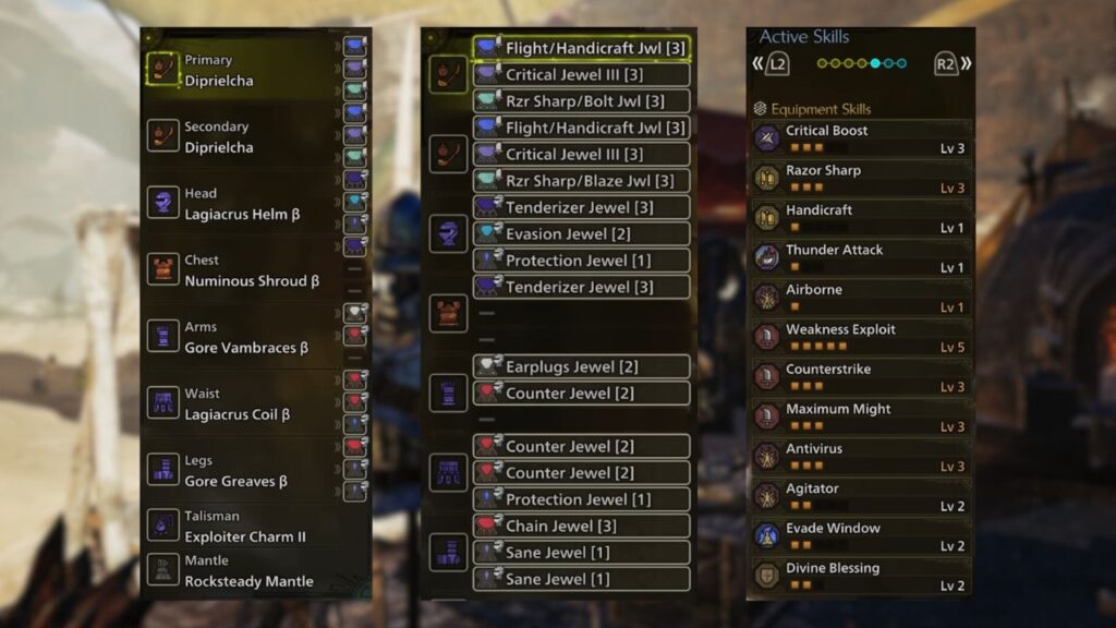 The Gore and Lagiacrus set bonuses activate Black Eclipse and Azure Bolt respectively, both of which provide significant Affinity boosts. Weakness Exploit and Maximum Might further stack onto this for even higher critical hit rates, while Counterstrike and Agitator cover raw damage output.