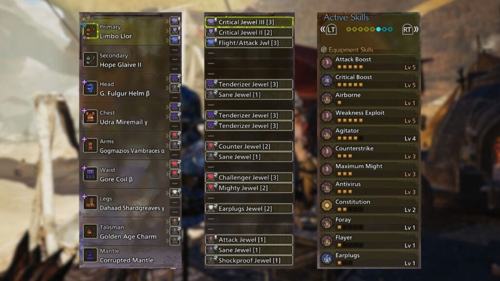 This setup provides higher levels of Weakness Exploit, Maximum Might, Agitator, and Evade Extender, all excellent skills for Insect Glaive. If you have five Physique Jewels available, Constitution is a great bonus skill to slot in as well.