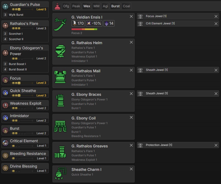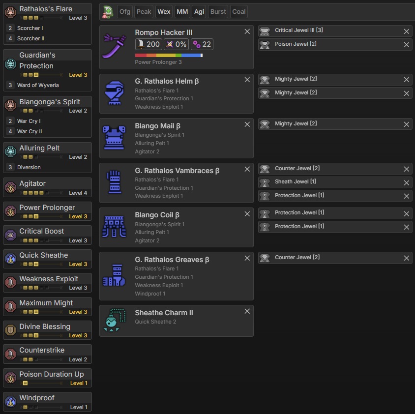 This set provides Weakness Exploit (Level 3), Agitator (Level 4), Power Prolonger (Level 3), and Maximum Might (Level 3), a strong combination that significantly boosts damage and critical hit consistency.
